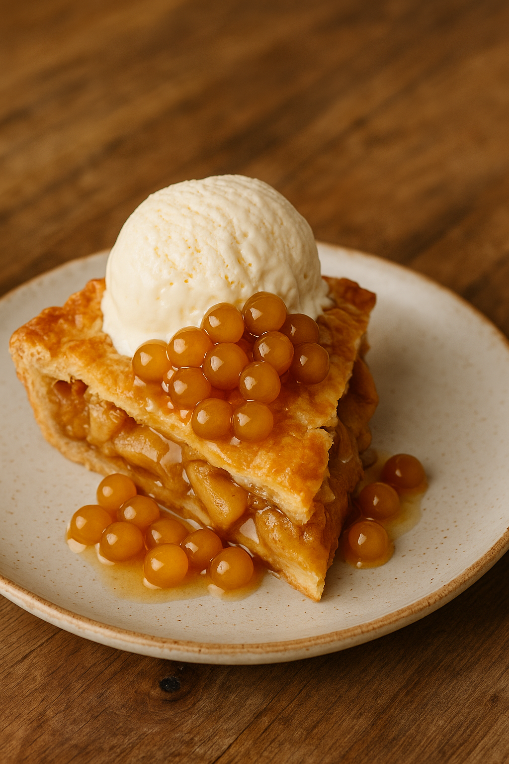 Warm cinnamon apples, buttery crust, gooey caramel sauce — topped with glistening Better Boba mango pearls for the perfect crunch-meets-chew experience.