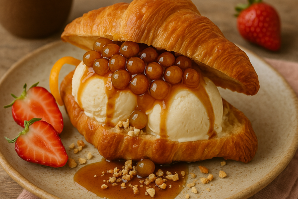Looking for your next boba + dessert obsession? Meet the Croissant Ice Cream Sandwich—with a Better Boba twist. Imagine a warm, flaky croissant split open and stuffed with creamy vanilla ice cream, then topped with gooey, caramelized brown sugar boba. Yeah, it’s a whole vibe.