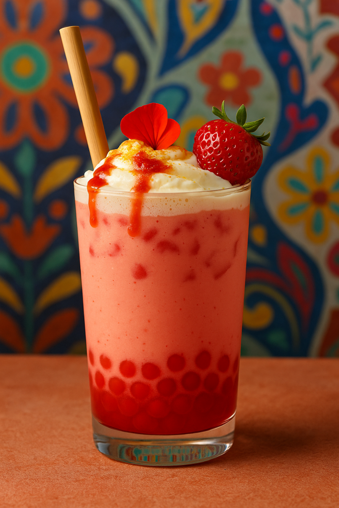 Add strawberry boba to the bottom of a glass. Pour the milk tea mixture on top. Crown it with whipped cream, strawberry drizzle, gold dust, and your chosen garnish.